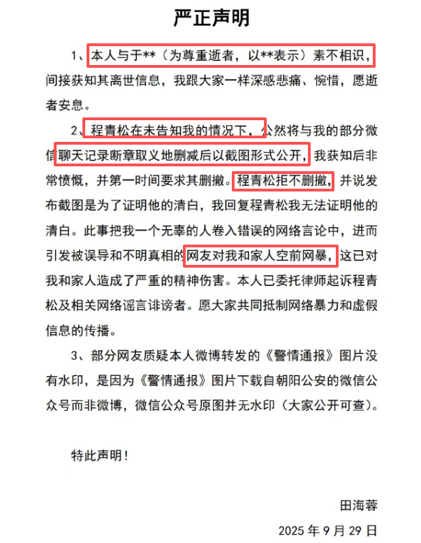 9月29日,田海蓉通过律师发布声明,正式起诉程青松及部分造谣网友。据声明披露,程青松为自证清白,未经允许公开了两人聊天记录,且截图存在明显删减。田海蓉多次要求删除未果后,决定采取法律手段维权。