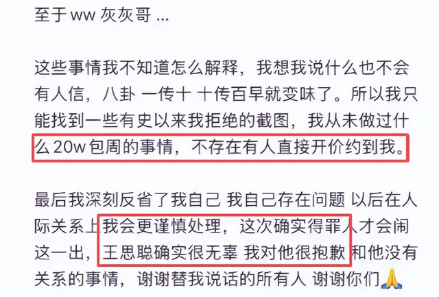 面对指控,涉事女网红迅速回应。她首先向王思聪道歉,承认曾在朋友圈发表不当言论,但否认饭局上提及王思聪追求自己一事,称这是有人故意造谣。对于20万元交易指控,她强调从未接受此类邀约。有趣的是,她在回应结尾表示同情王思聪,称其“无辜”卷入争议。