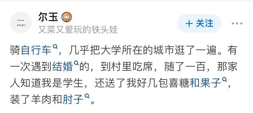 另一位网友讲述了自己当年在东北上学的疯狂举动:“当年在东北上学,有个礼拜连续通宵打了两晚上游戏,又突然想回家(没提前通知爸妈),没多少钱买了硬座,当时还没得高铁,硬座26个小时,睡了22个小时才醒,睡醒背的包都掉地上了也没人捡(可能一眼穷学生)。”