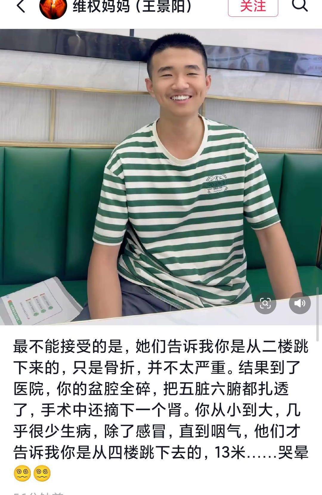 王景阳的妈妈回忆,当时他们被告知孩子是从2楼跳下的,只是骨折并不严重。但到了医院才发现,孩子的盆腔全碎了,五脏六腑都被扎透,手术中还摘除了一个肾。平时身体一直很健康的孩子,怎么会突然发生这种事呢?