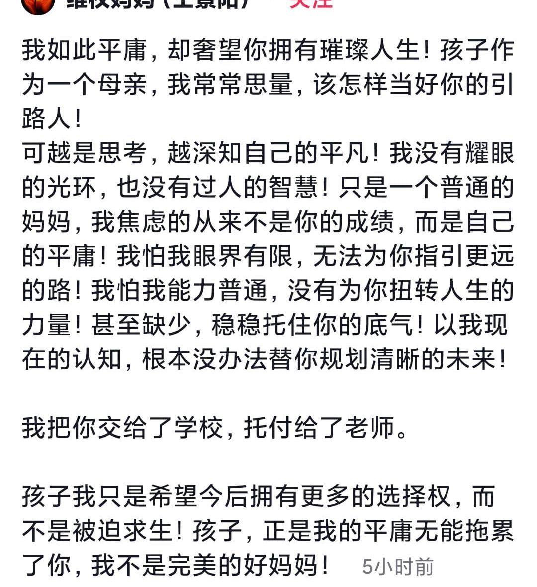 妈妈的字字泣血,让人感受到了母爱的伟大。1.85米高的大男孩,在学校有什么事一定要告诉家人,告诉父母,一起面对。