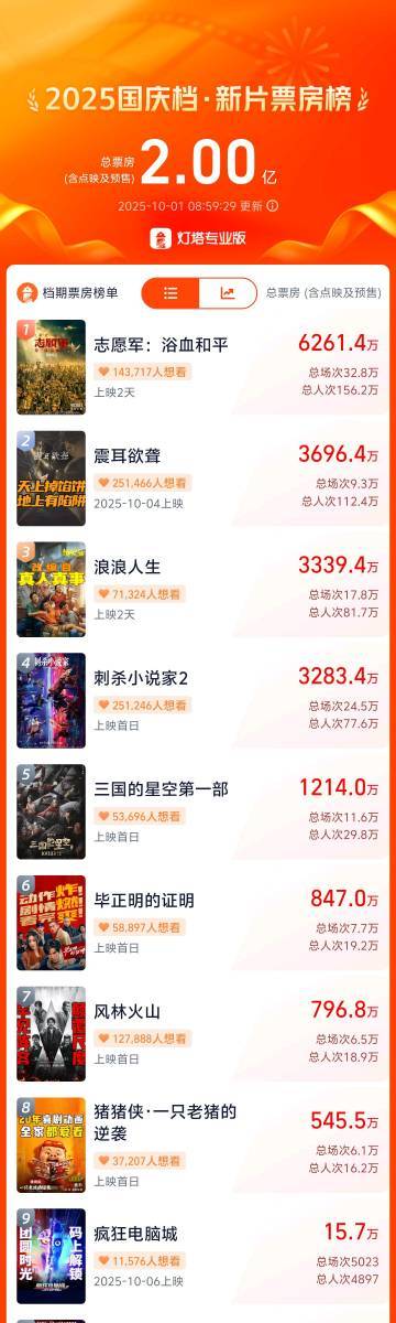 据灯塔专业版最新数据,截至10月1日08时59分,2025年国庆档新片总票房(含点映及预售)已正式突破2亿元大关,市场热度持续攀升。
