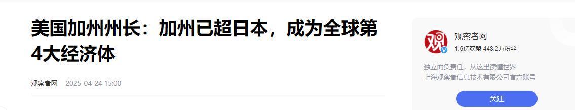 信息来源:美国加州州长:加州已超日本,成为全球第4大经济体 观察者网2025-04-24 15:00