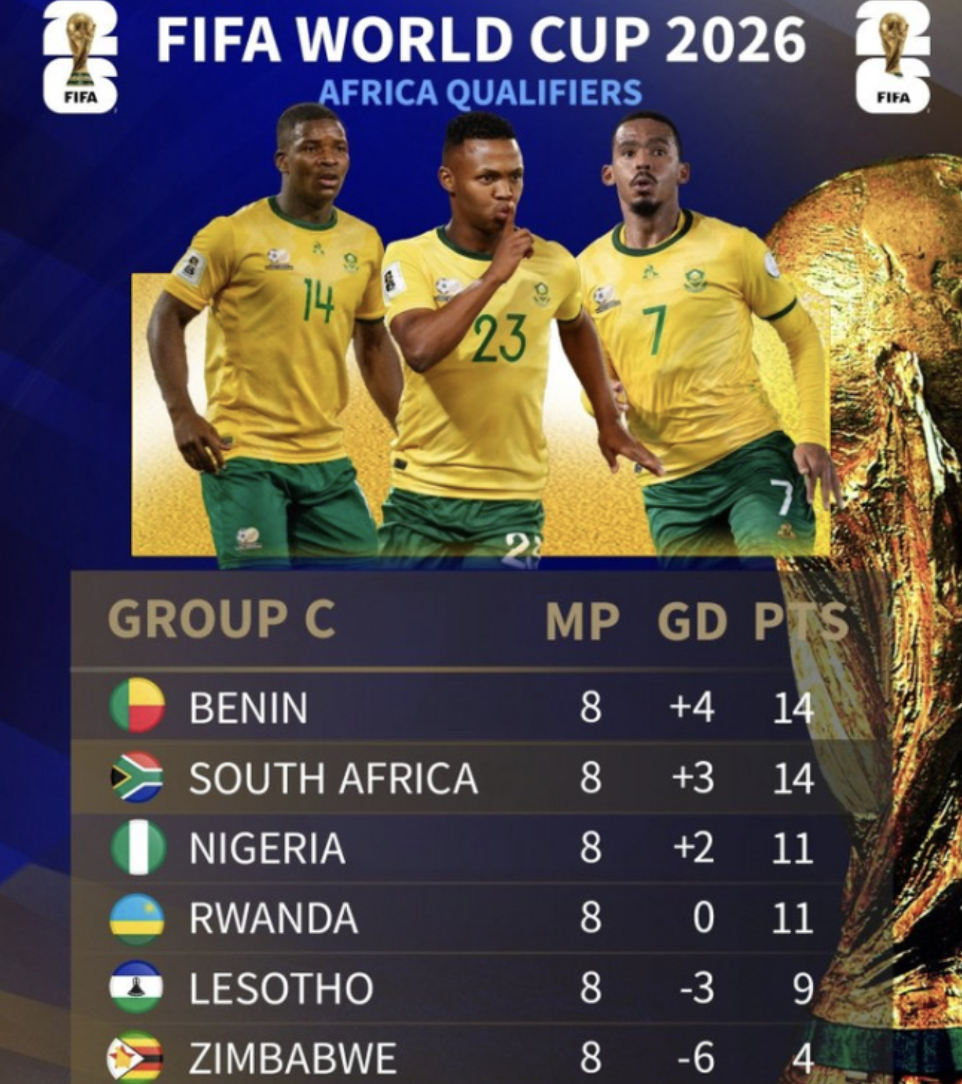 改判后,世预赛非洲区C组积分榜发生剧变:贝宁队以14分和1个净胜球的优势登顶小组第一,南非队同样积14分但因净胜球劣势跌至第二,莱索托队积分增至9分仍排名第五。小组赛还剩最后两轮,只有头名才能直接晋级世界杯,南非队的违规让同组的尼日利亚等队看到了直接出线的希望。值得一提的是,上届世预赛中,奥斯梅恩领衔的尼日利亚队因无缘出线,曾引发愤怒的球迷冲入球场闹事,此次他们能否把握机会晋级成为焦点。