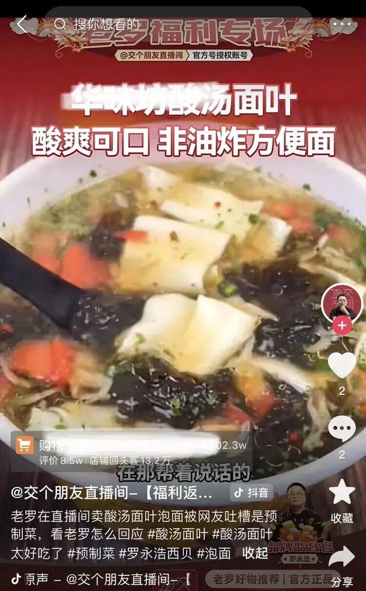 9月29日晚,罗永浩在直播中推荐酸汤面,原本和谐的带货氛围因一条评论被打破——有观众提问:“这是预制菜吗?”