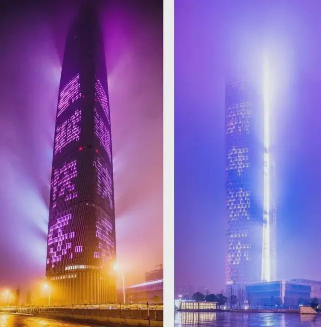 建筑中缝是整座大厦的视觉焦点,被誉为“武汉之光”、“泛海桅杆”。其竖向微弧线设计韵律感强,光效选用蓝白交融的湖蓝色,自上而下由白渐蓝,如水流倾泻,与梦泽湖景形成虚实呼应的整体意象。