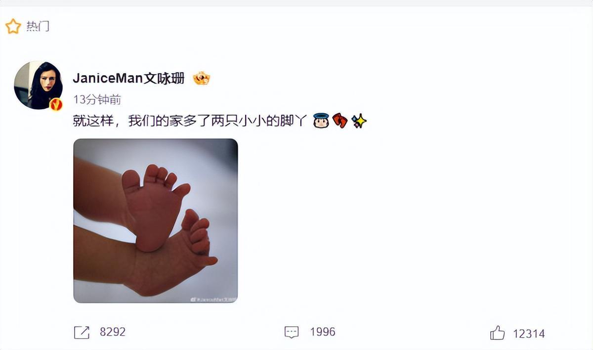 值得一提的是,30日下午,另一位女星文咏珊也通过社交媒体宣布了自己当妈妈的喜讯,并晒出了宝宝的脚丫照。两位宝宝同日诞生,堪称缘分匪浅。