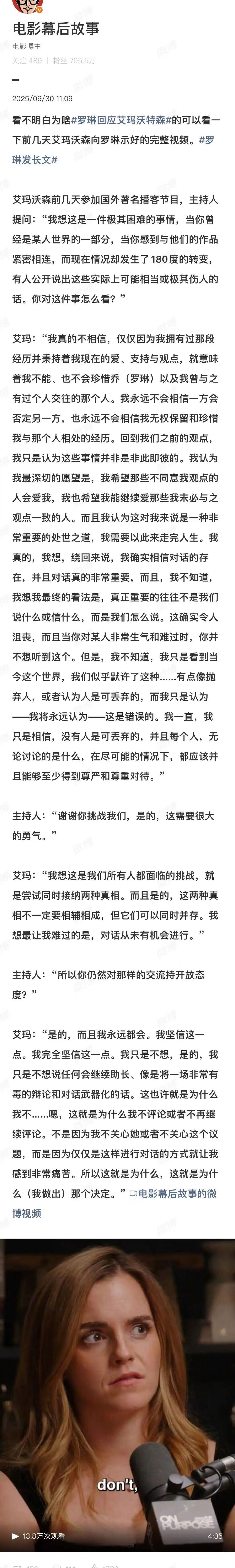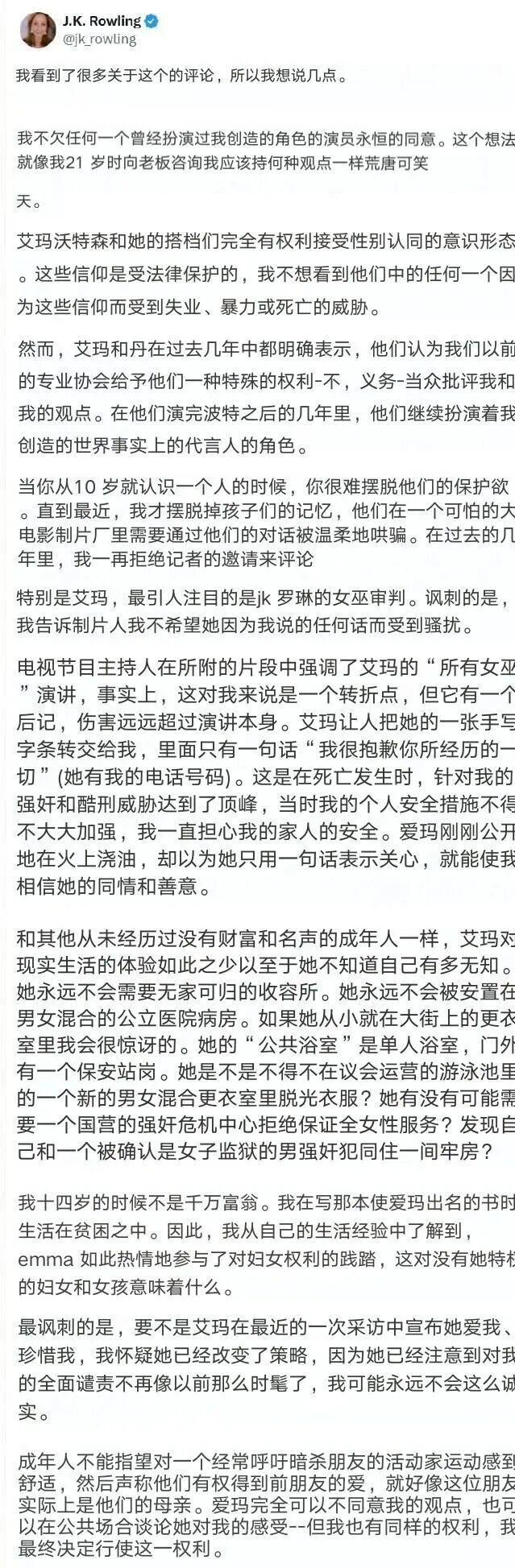 艾玛的“同情”表演本质上是算计风险后的投机。早年她需要罗琳作为靶子完成从“赫敏”到“人权偶像”的转型,如今又放软姿态谈“珍视”,试图塑造“宽容”人设。这种将罗琳视为符号工具的生存策略,在罗琳的长文反击中彻底暴露。