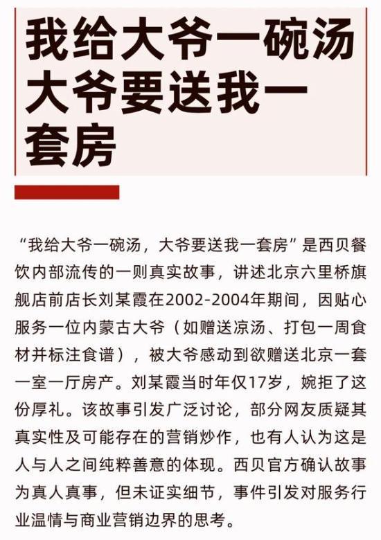 除了筱面造假事件外,西贝近期还因一则营销活动引发网友热议。该活动宣称“我给大爷一碗汤大爷要送我一套房”,并声称这是真实事件。然而,网友们对此并不买账,纷纷调侃道:“大爷原话估计是‘你这汤这么贵还不如把房子给你算了’。”这无疑又给西贝的口碑蒙上了一层阴影。