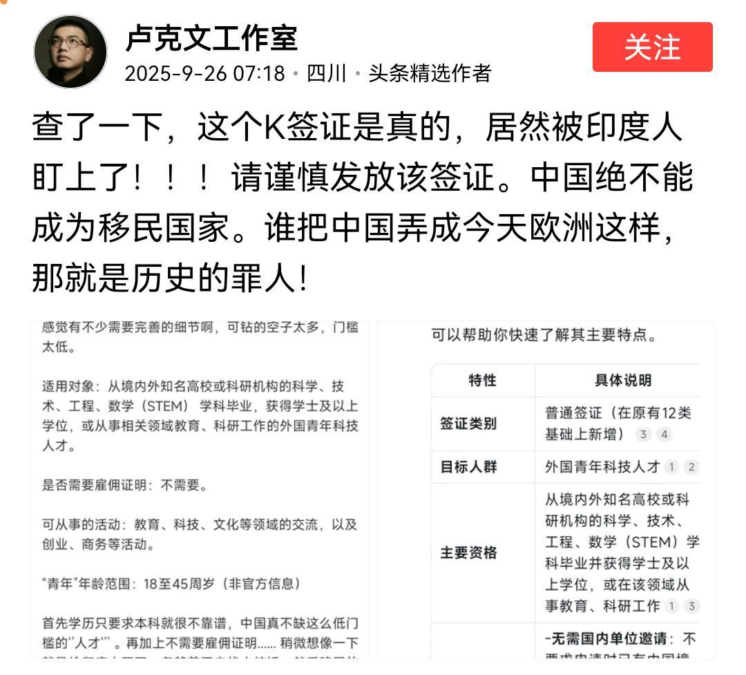 卢克文首次发声,便直指K签证已被“隔壁三哥”(指印度)盯上,因此他第一时间呼吁要谨慎对待K签证的发放。这一言论迅速在网络上发酵,引发了网友们的热烈讨论。
