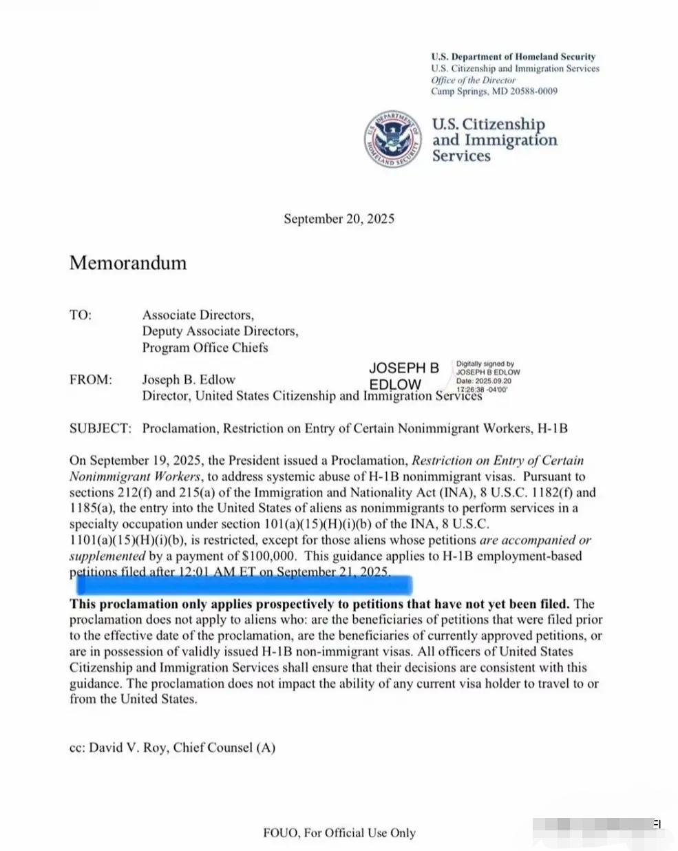 第一,美国H-1B工作签证政策调整,签证费用大幅上涨。自特朗普再次上台后,美国对H-1B工作签证做出了重大调整。从2025年9月21日起,为期12个月,所有从境外进入美国的H-1B外籍人员必须缴纳一次性10万美元的费用。这一政策仅适用于“入境”场景,已在美国境内的人暂时不受影响,但一旦离境再返回,也会触发缴费要求。这一变化无疑增加了外籍人员赴美工作的成本。