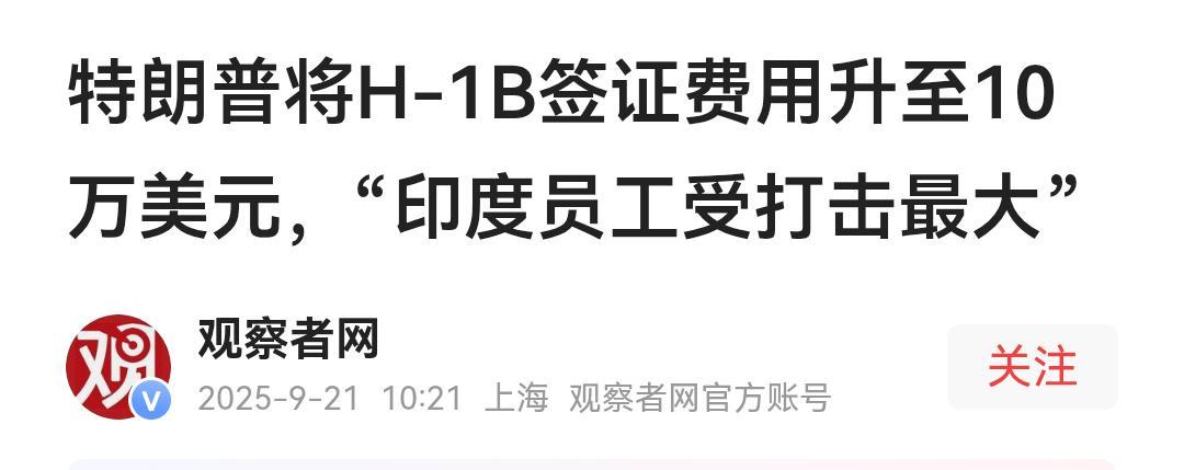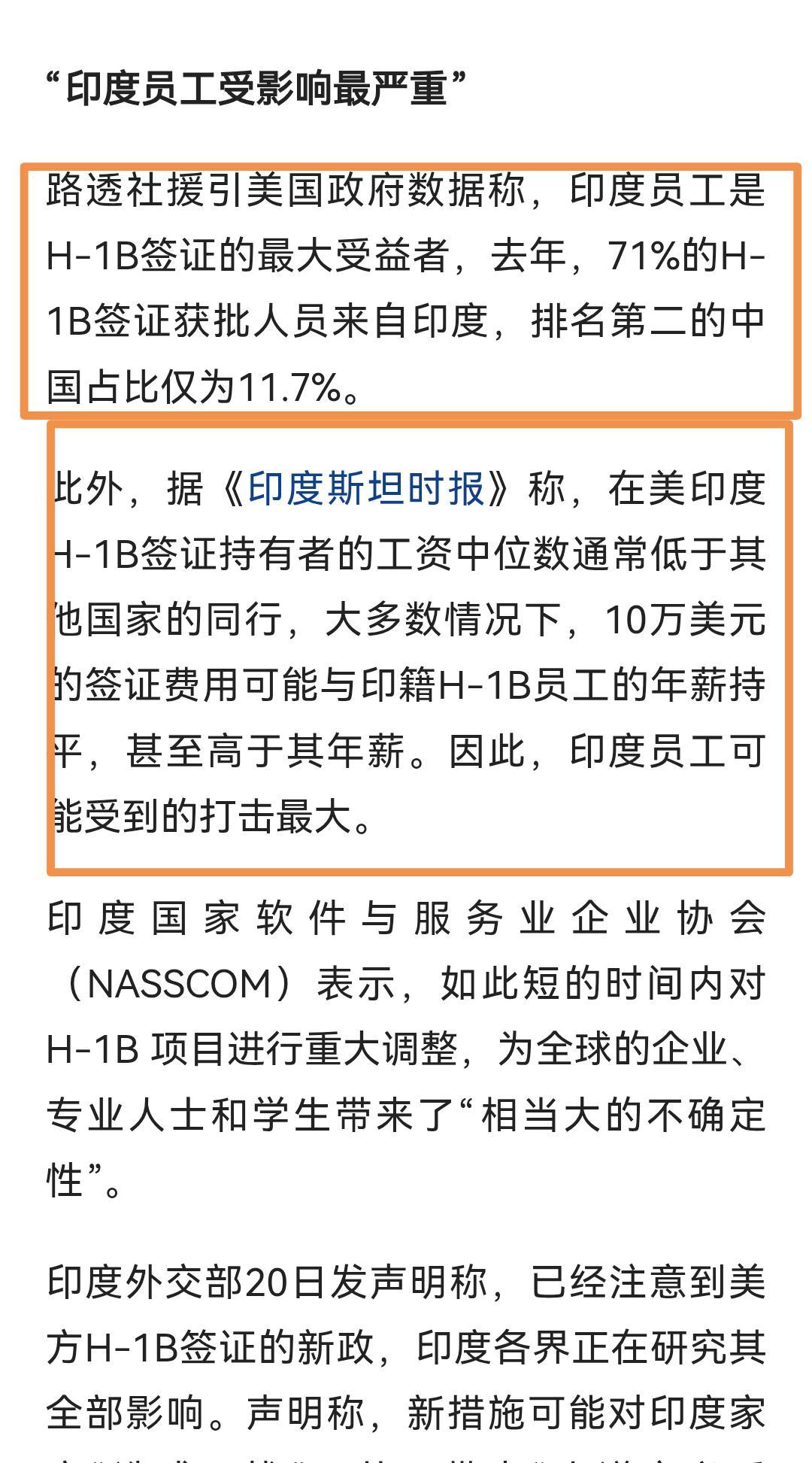 比外,据《印度斯坦时报》称,在美印度 H -1B签证持有者的工资中位数通常低于其他国家的同行,大多数情况下,10万美元的签证费用可能与印籍 H -1B员工的年薪持平,甚至高于其年薪。因此,印度员工可能受到的打击最大。