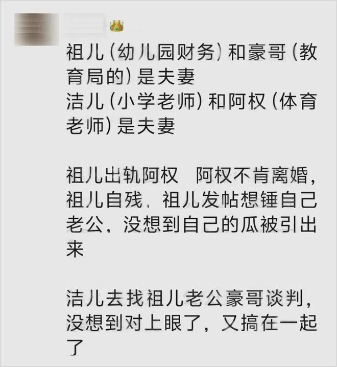 这场伦理风暴的核心人物,是幼儿园财务人员祖儿与少年宫体育教师阿权。据知情人士透露,已婚的祖儿与同样婚内的阿权发展出不正当关系后,多次要求对方离婚重组家庭。当阿权拒绝这个提议后,祖儿竟采取自残方式施压,却依然未能改变局面。
