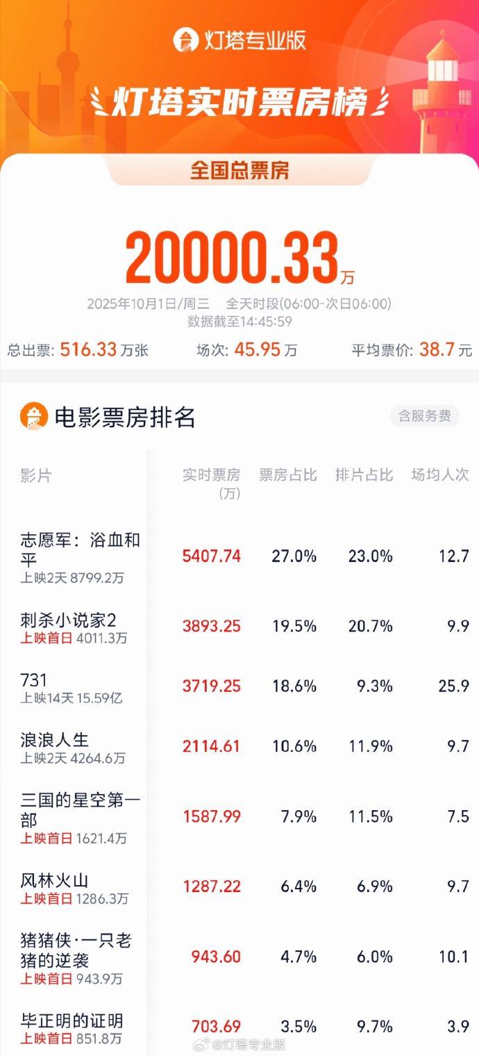 据权威电影数据平台灯塔专业版最新统计,截至2025年10月1日14时46分,本年度国庆档首日(即10月1日国庆节当天)的电影票房成绩斐然,已成功突破2亿元大关。
