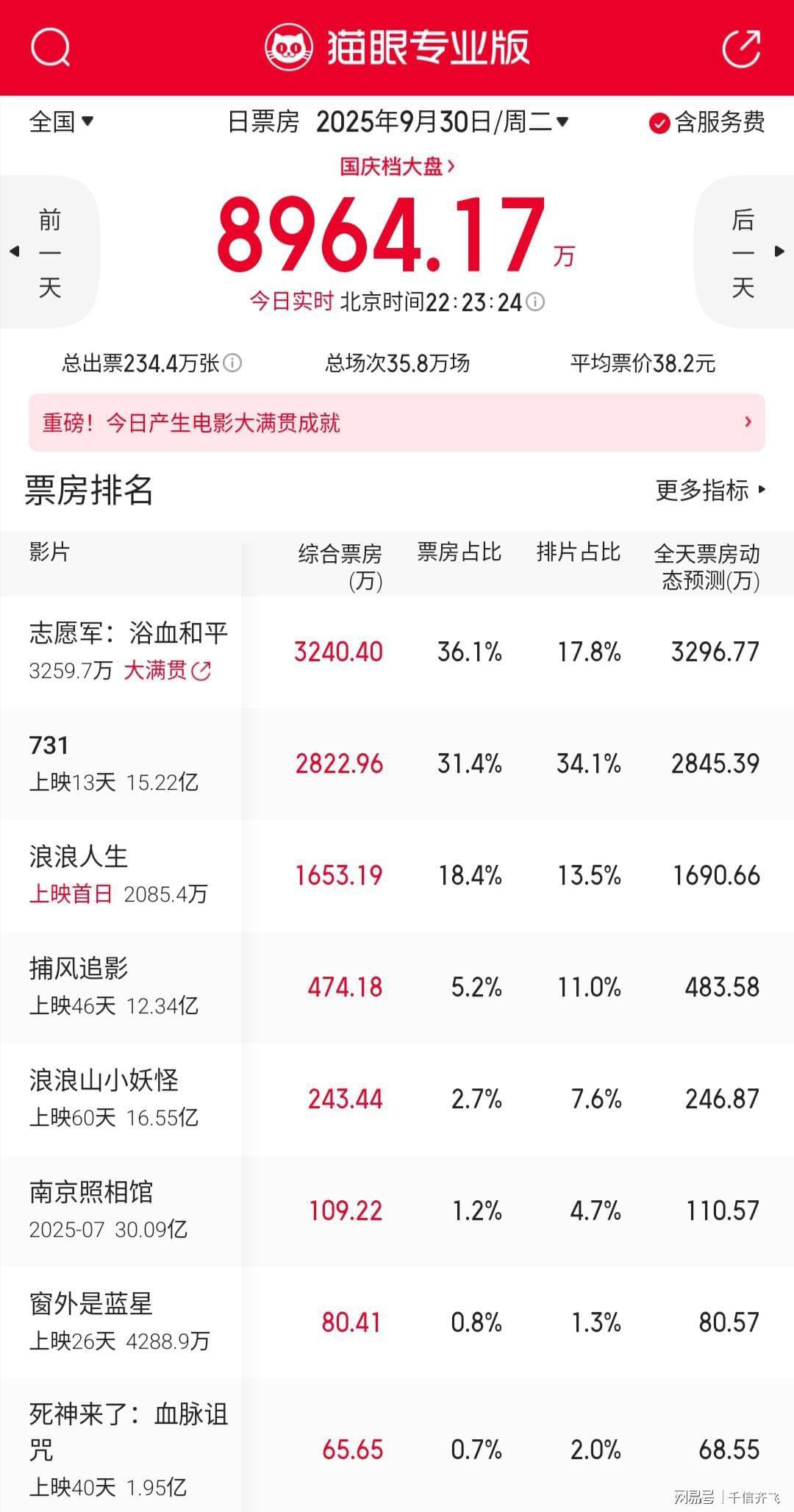 2025年9月30日(周二)截止22:23:24大盘票房8964.17万人民币;