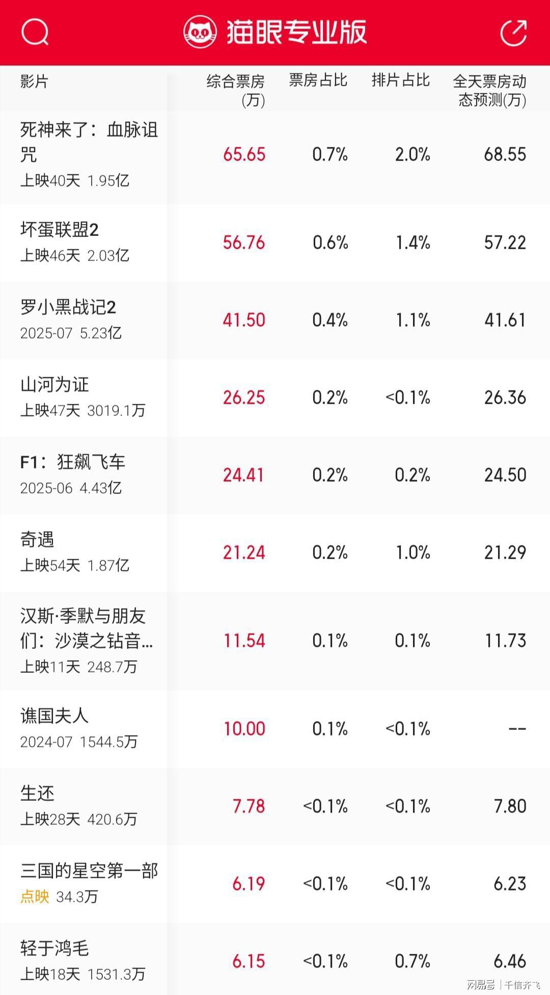 TOP5 陈廖宇监制,於水导演,陈子平、路扬、董汶亮和韩冬青配音的动画片《浪浪山小妖怪》当日票房243.44万,位列单日票房榜第五名,票房占比2.7%,排片占比7.6%,上映60天累计票房16.55亿人民币,这一成绩位列2025年度票房榜第四名,按照猫眼平台预测最终票房16.77亿人民币。