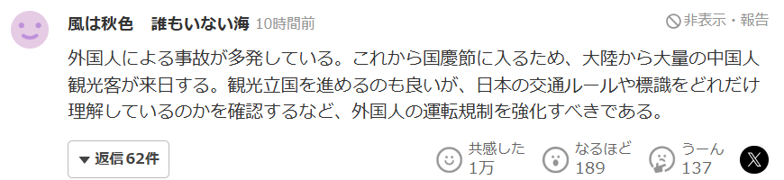 外国人引发的事故频发。随着国庆节临近,将有大量中国大陆游客来日。推进“观光立国”固然很好,但也有必要确认他们对日本交通规则和标识的理解程度等,应该加强对外国人驾驶的管理和限制。