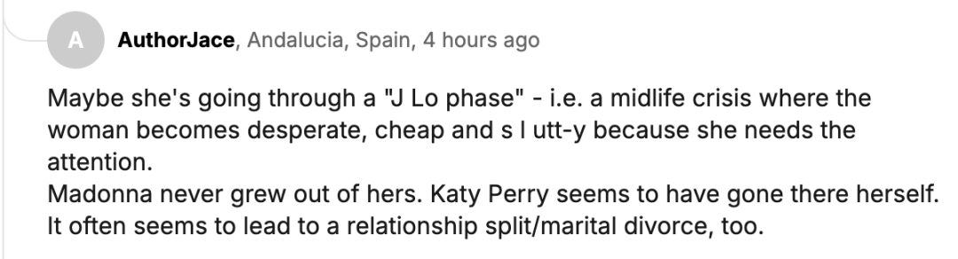“也许她正经历着“詹妮弗·洛佩兹阶段”——也就是中年危机,女人变得绝望、卑鄙、放荡,因为她需要关注。麦当娜从未摆脱过这种状态。水果姐似乎也经历过。这种状态似乎也常常导致感情破裂或婚姻破裂。”