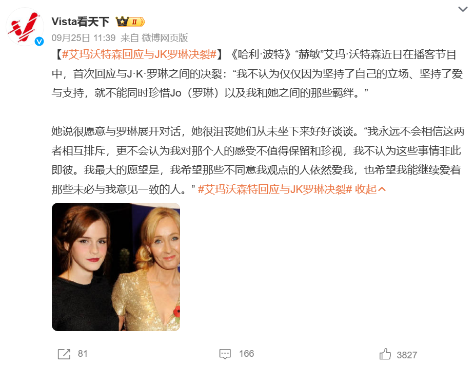 9月25日,她在最新的播客《OnPurposewithJayShetty》里回应了跟罗琳的关系,说很遗憾两人没有坐下来好好聊过,说就算观点不同但还是可以“继续爱着”。