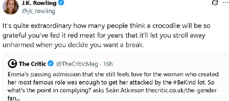 这个行为激怒了罗琳,她先是于9月27日在社交平台转发了艾玛的恶搞视频,28日又发文说“竟然有那么多人认为,多年以来一直给鳄鱼喂肉吃,当你想停下来它就会人畜无害地让你离开”。