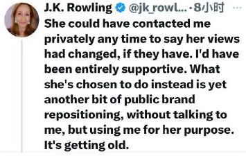 罗琳还很钢,说真想和解“她可以私下联系我”。还说艾玛在电台上的言论是为了重塑自己的公共形象,是利用自己达成她的目的,而这一切现在都行不通了。