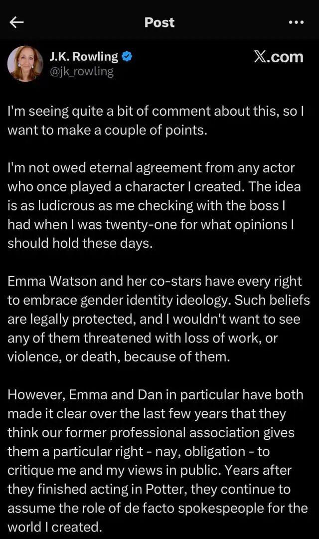 然而,这番“想和好”的话却反而激怒了罗琳。9月29日,罗琳火力全开,发表700字长文回怼:“我没义务永远和某个曾演过我笔下角色的演员保持一致意见。这就像我还要去问21岁时的老板,现在我该持什么观点一样,荒谬至极。”