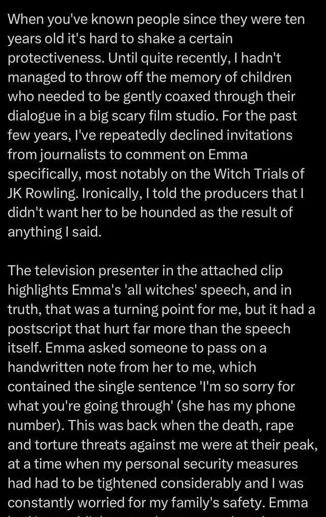 罗琳还提到,自己多年来一直拒绝在采访里点名批评艾玛,“因为不想害她被舆论追杀”。然而,艾玛当年曾托人转交过一张手写小纸条,上面只写了一句话:“我很抱歉你正在经历这些。”(艾玛有罗琳的电话号码)