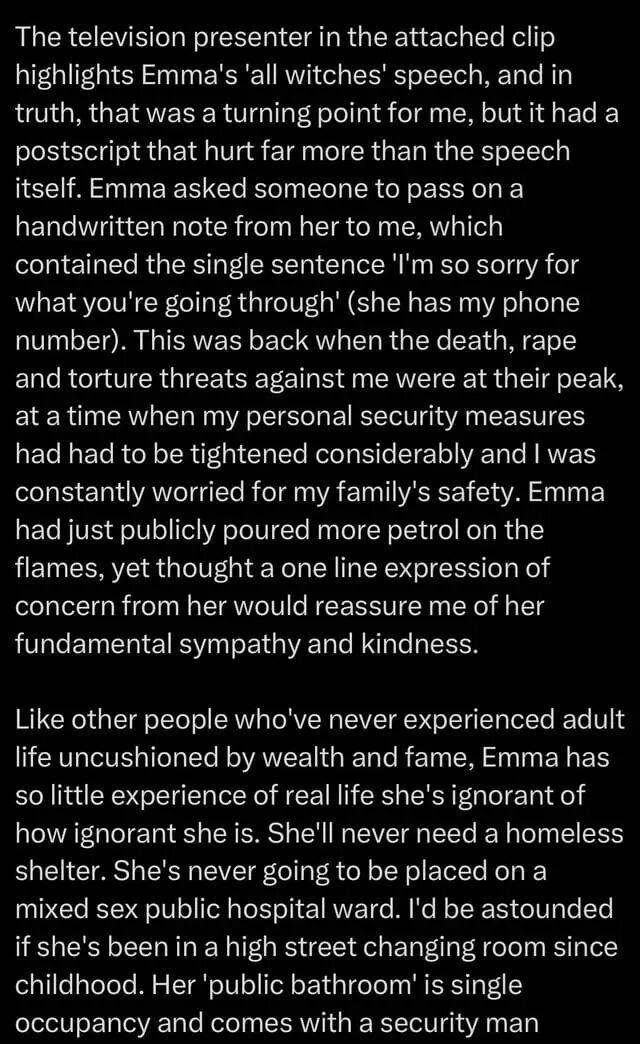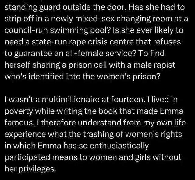 罗琳在长文中还详细列举了艾玛的“特权”生活。她指出,艾玛永远不会需要无家可归者收容所;不会被安排进公立医院的混合病房;她的公共厕所是单间,还有保镖守门;她不会在社区泳池的混合更衣室里脱衣服;她不会去国家运营的性侵危机中心,也不会被迫和“自称女性的男性罪犯”同住一间牢房。