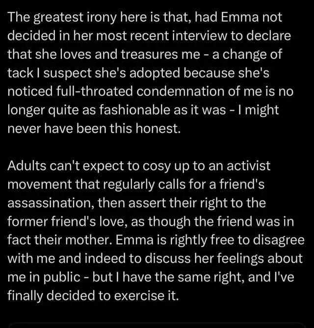 她说,“成年人不能指望与一个经常呼吁暗杀朋友的激进分子搞好关系,然后又宣称自己有权得到这位前朋友的爱,就好像这位朋友实际上是他们的母亲一样。”