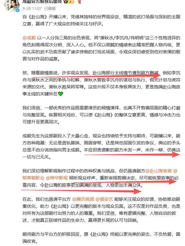 粉丝对成毅戏份被删,更表达了大规模的不满。