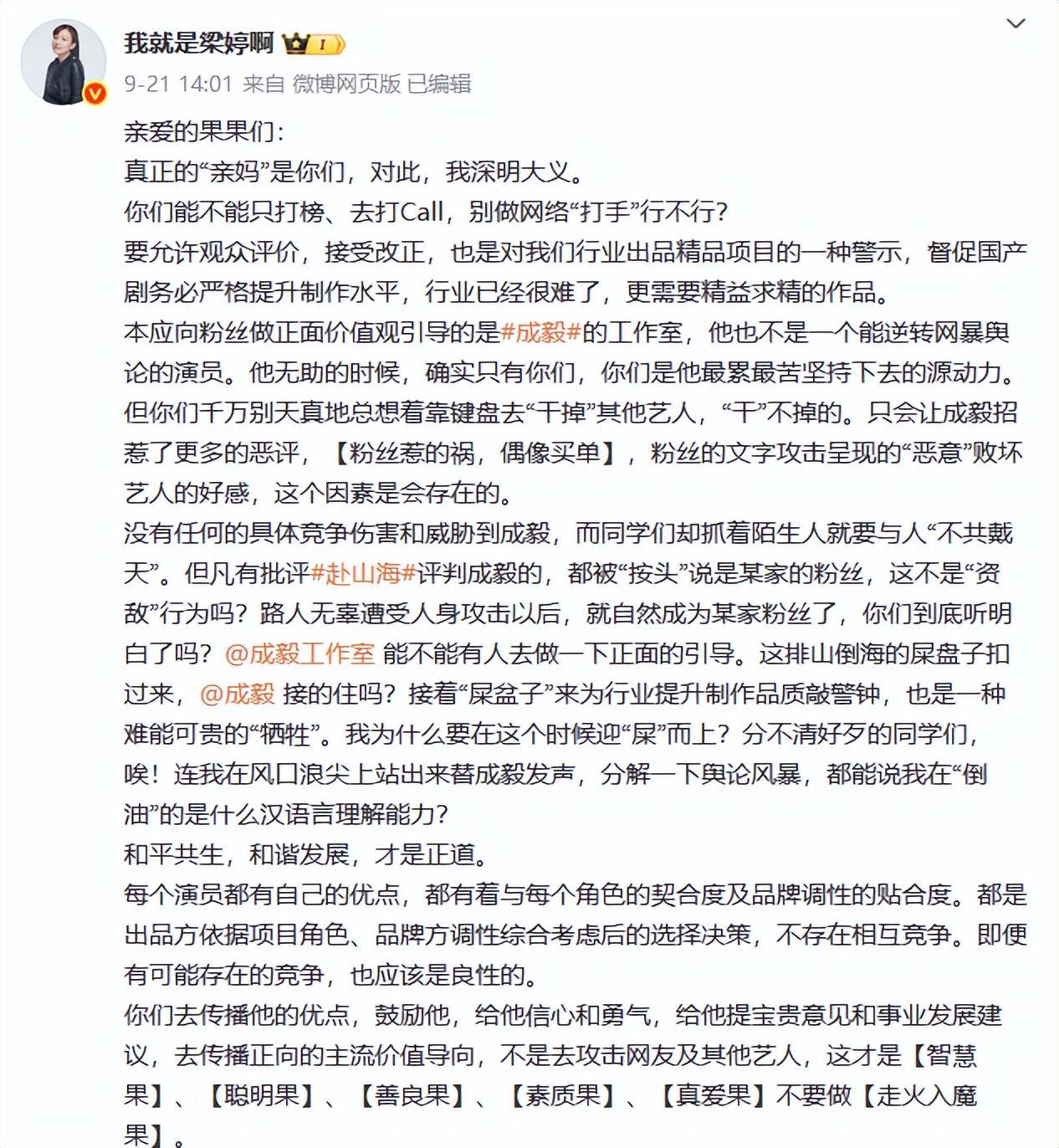对于粉丝后援会的这篇长文,成毅前公司老板梁婷也站出来仗义执言。