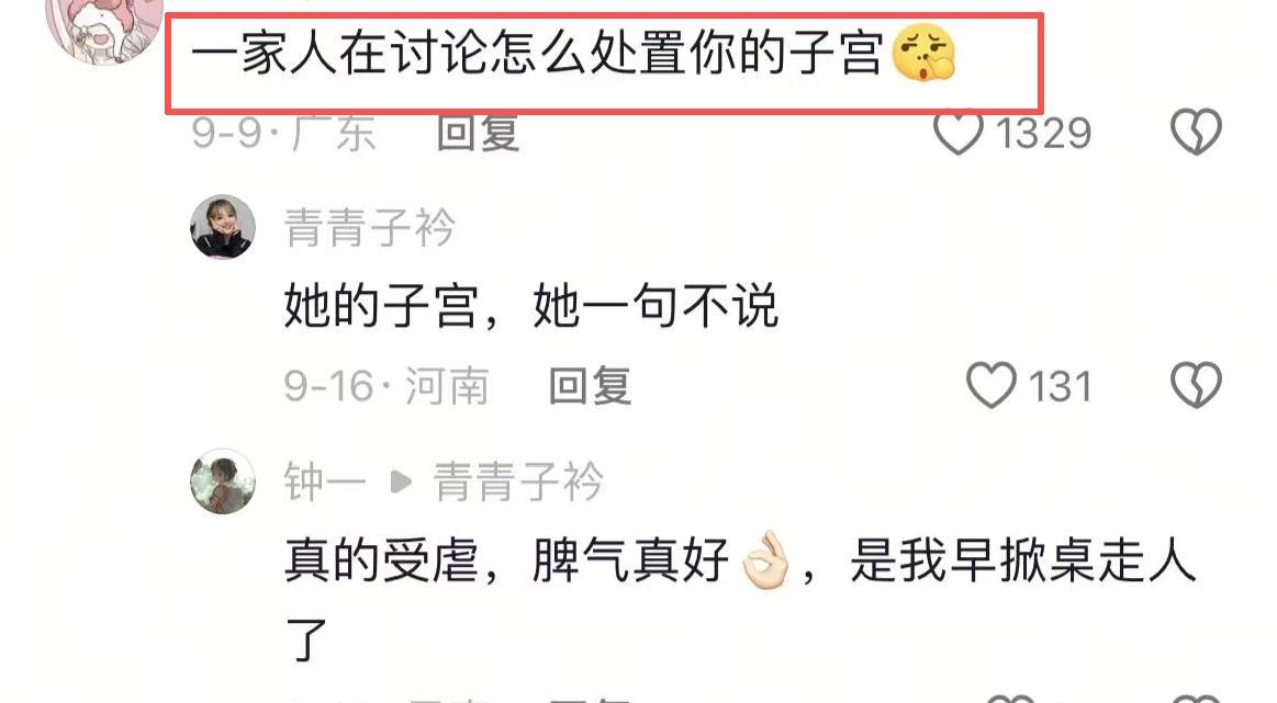 网友看了感到窒息,有人直言不讳:“一家人在讨论你的子宫,你却没有发言权。”
