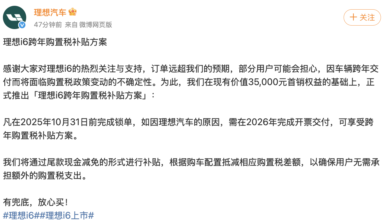 此外,该销售人员还透露:“由于购置税缘故,客户会强调今年内一定要提车,所以也提早锁了单。”9月30日,理想汽车方面表示:“我们在现有价值3.5万元首销权益的基础上,推出理想i6跨年购置税补贴方案:凡在10月31日前完成锁单,如因理想汽车的原因,需在2026年完成开票交付,可享受跨年购置税补贴方案。我们将通过尾款现金减免的形式进行补贴,根据购车配置抵减相应购置税差额,以确保用户无需承担额外的购置税支出。”