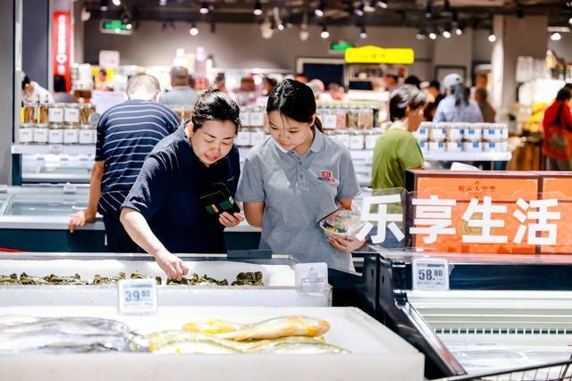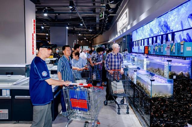 水产区聚集了进口三文鱼、波士顿龙虾、大闸蟹等高品质水产,顾客可以现捞现选;肉类柜台更贴心,能根据需求免费切片、切丝、绞肉馅,“不用自己在家剁肉馅了,太方便了!”准备做中秋饺子的李女士点赞道。