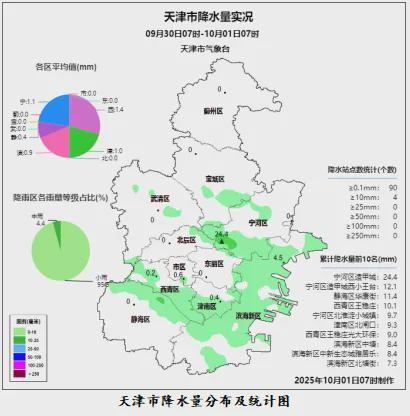 天津昨夜出现中雨,部分地区出现分散性阵雨或雷阵雨,个别点达到中雨级别。全市平均降雨量0.4毫米,最大降雨量24.4毫米出现在宁河区造甲城,最大小时降雨量也达到20.3毫米。