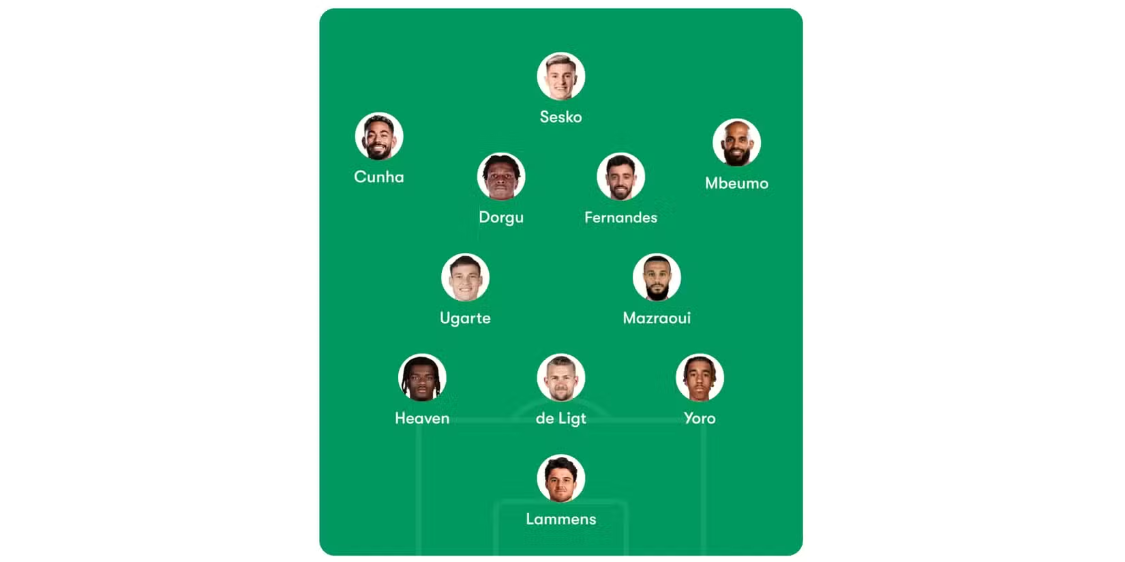 帕特里克·多古与努塞尔·马兹拉维继续担任边翼卫,布鲁诺·费尔南德斯与曼努埃尔·乌加特也维持搭档关系,但豪森建议马兹拉维向内收至乌加特身旁,形成“双后腰屏障”——这一调整能让曼联构建“后防三将+双后腰”的五人防守体系,既稳固防线,又为另外两名中场创造前压空间。