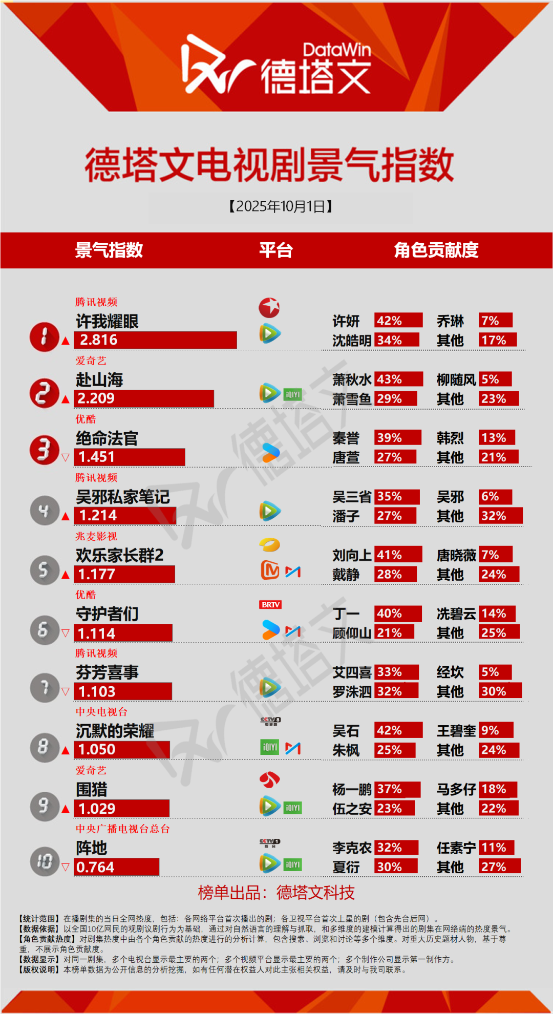 许我耀眼(许妍42% 沈皓明34%) 赴山海(萧秋水43% 萧雪鱼29%) 绝命法官(秦誉39% 唐萱27%) 吴邪私家笔记 欢乐家长群2 守护者们 芬芳喜事 沉默的荣耀 围猎 阵地