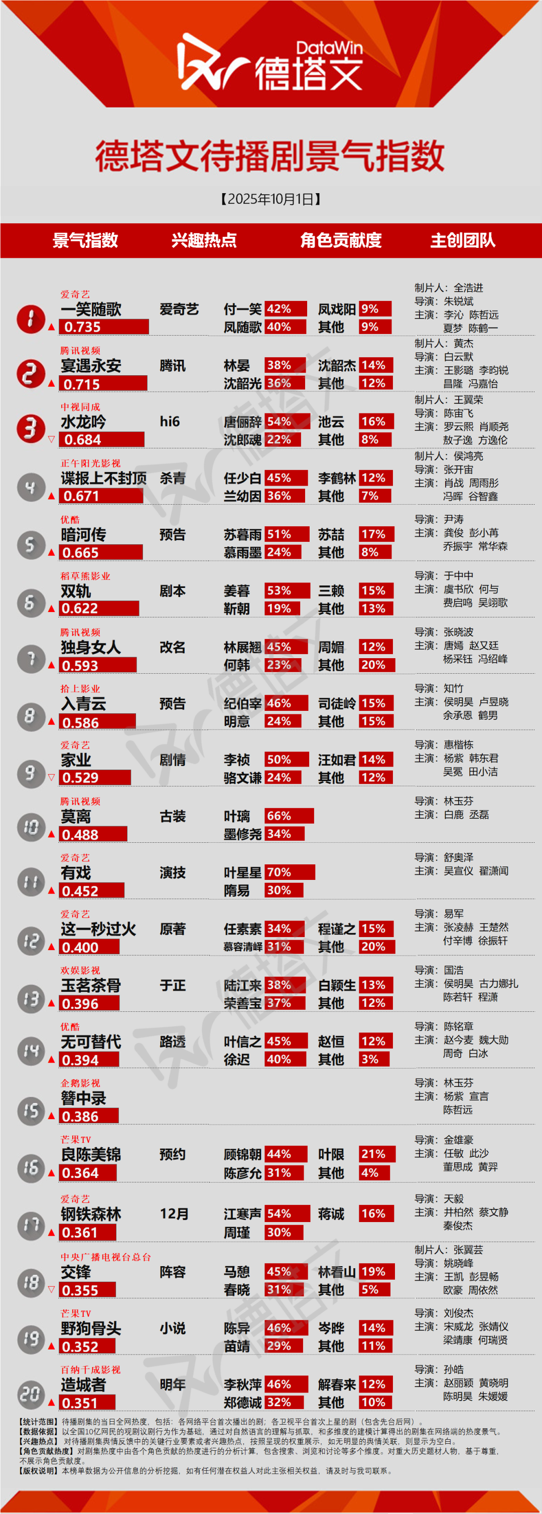 一笑随歌(付一笑42% 凤随歌40%) 宴遇永安(林晏38% 沈韶光36%) 水龙吟(唐俪辞54% 沈郎魂22%) 谍报上不封顶 暗河传 双轨 独身女人 入青云 家业 莫离 有戏 这一秒过火 玉茗茶骨 无可替代 簪中录 良陈美锦 钢铁森林 交锋 野狗骨头 造城者