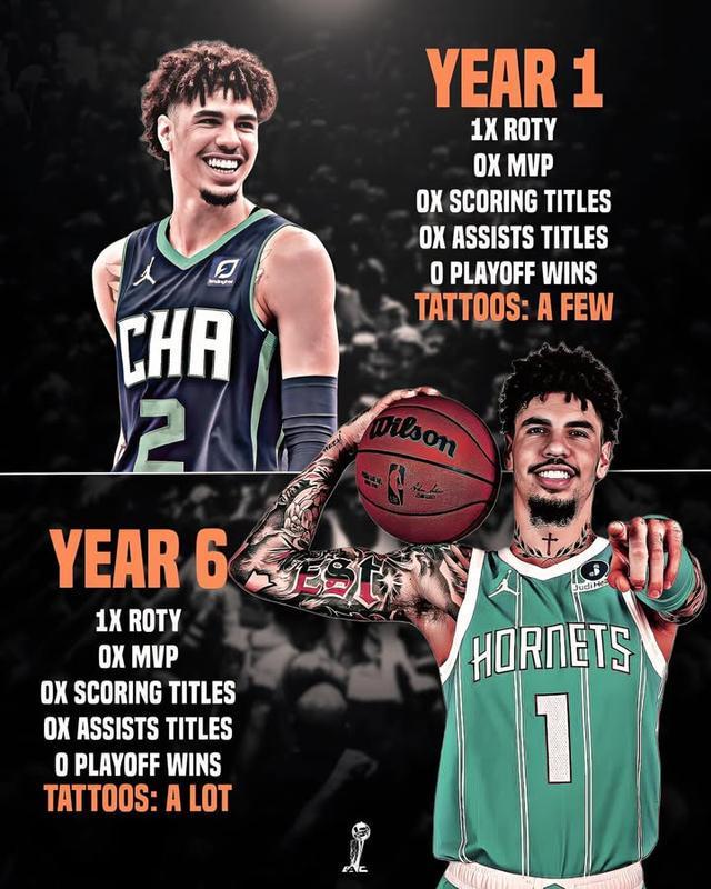 近日,美国媒体对黄蜂队当家球星拉梅洛·鲍尔(三球)的职业生涯进行了幽默调侃,指出其在进入NBA的6年时间里,虽然仅获得过最佳新秀这一项荣誉,但文身数量却呈现出逐年递增的趋势。