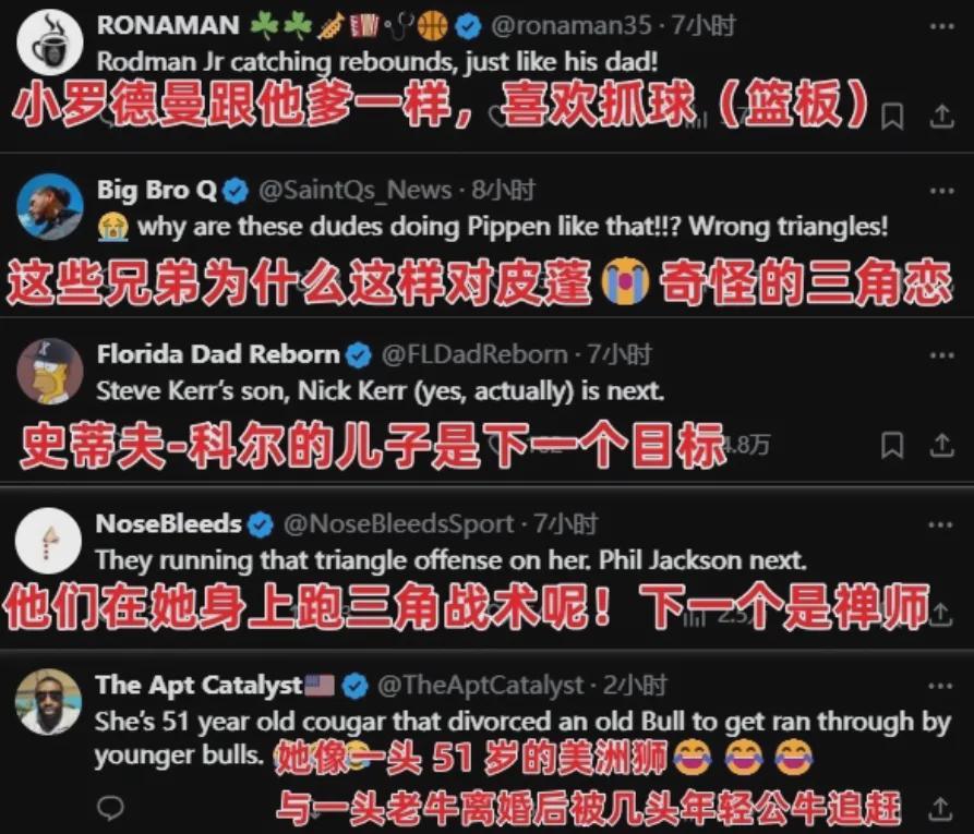 然而,拉尔萨阿姨的感情生活并未因此停滞。她很快便将目光投向了乔丹的儿子——马库斯。这可真是一场名副其实的‘母子恋’,毕竟乔丹与皮蓬曾是队友,拉尔萨作为皮蓬的前妻,小时候还抱过马库斯呢。