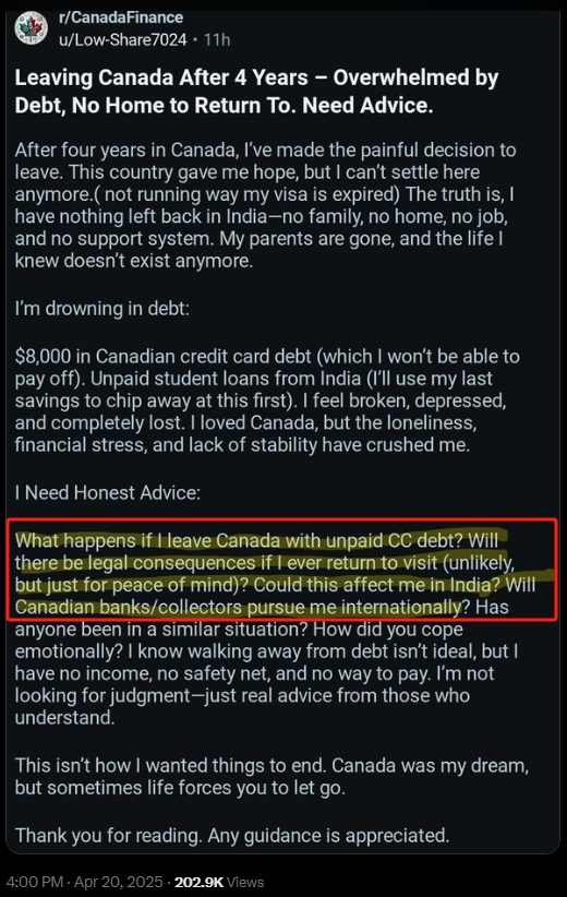 求助请问:如果我离开加拿大时信用卡债务未还,怎么办?如果我回加拿大会不会有法律后果?这会对我在印度的生活造成影响吗?加拿大的银行/催收人员会在跨国追究我的责任吗?有人遇到过类似的情况吗?你是如何应对的?我知道逃债并非理想状态,但我没收入,也没办法还债。我不想听人批评,只想听听那些理解我的人的真心建议。