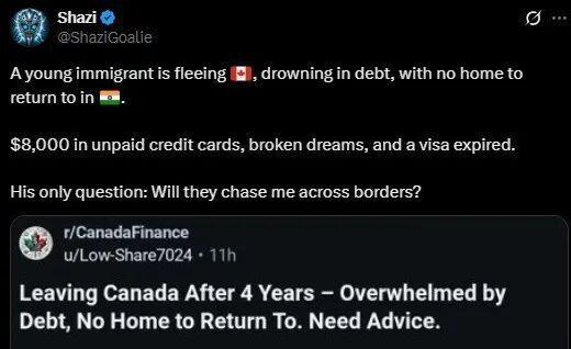 9月底,一名印度留学生在Reddit发帖,题为《四年后离开加拿大——债台高筑,无家可归……求助》。