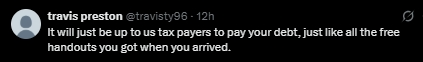 “你们的债务最终将由我们纳税人来偿还,就像你们刚来时领到的所有免费救济一样。”