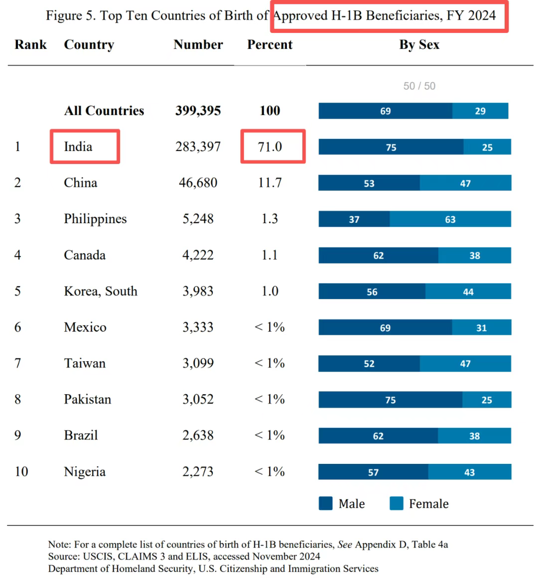 然而现实呢?根据美国移民局的数据,2024财年,印度人占了71%的H-1B配额。一大批印度外包公司——Infosys、Wipro、TCS——专门研究“签证套利”:他们会在内部动员数千名员工同时递交申请,利用“一人多抽”的策略提高中签率。