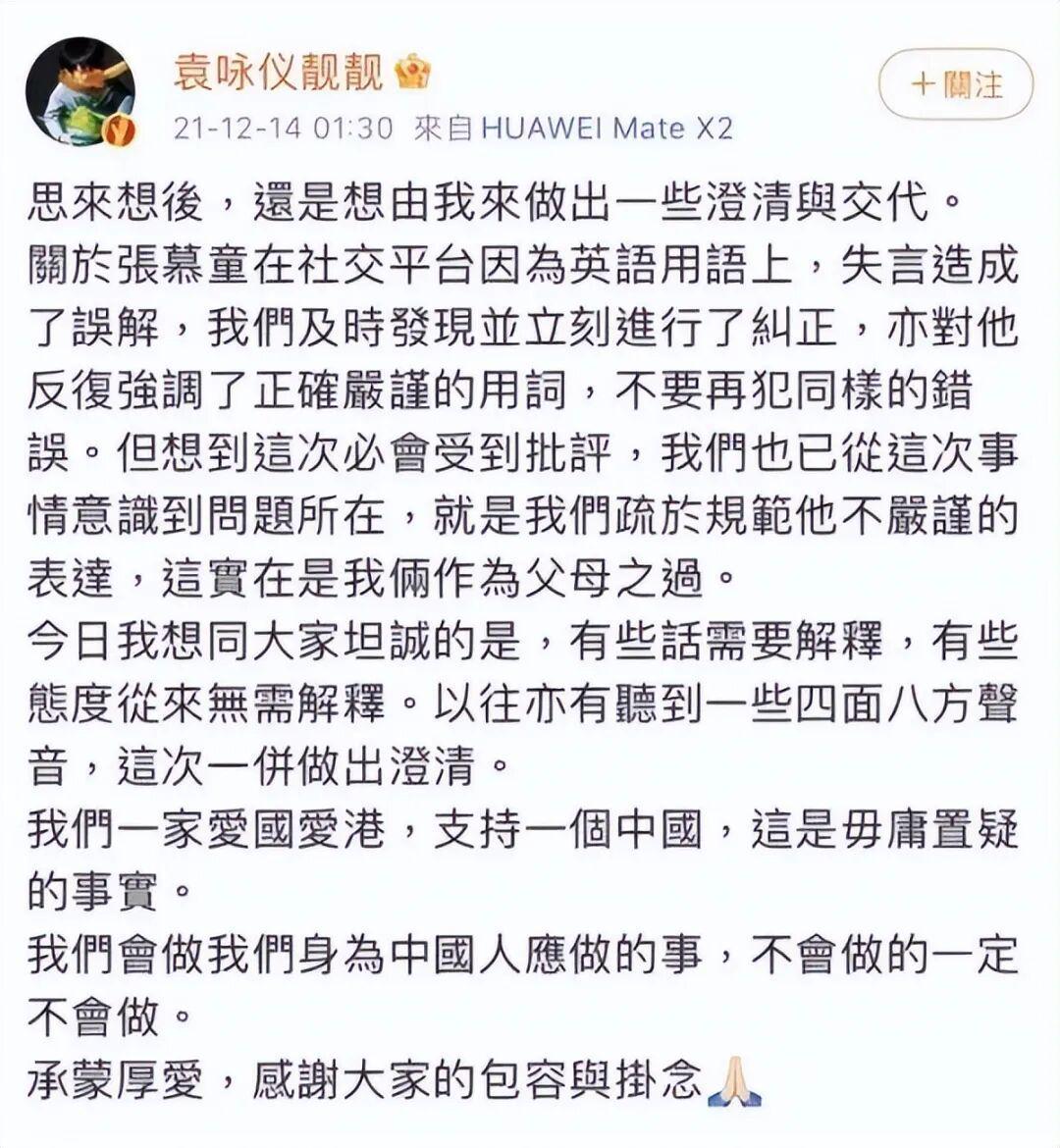 当天深夜1:30分,还是由袁咏仪出面代替儿子道歉,并且表态“我们一家爱港爱国”。