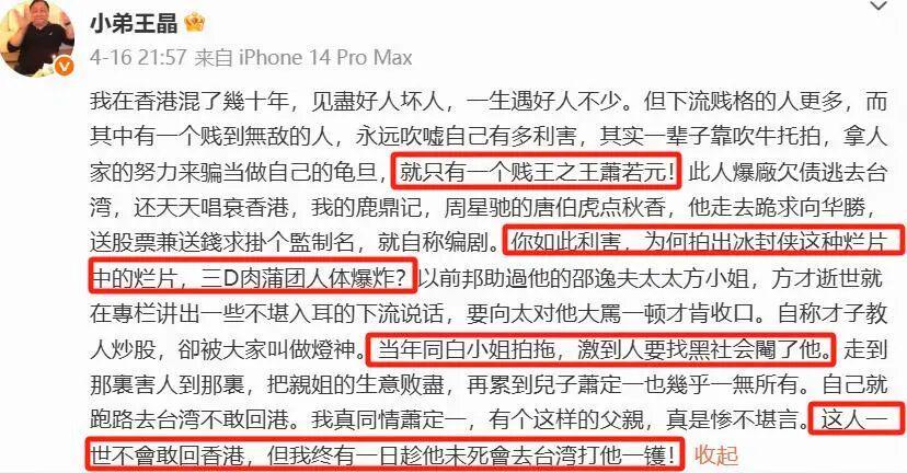 去年年底王晶开了一档个人脱口秀节目,大爆娱乐圈猛料,他曾大骂香港“鬼才编剧”萧若元。