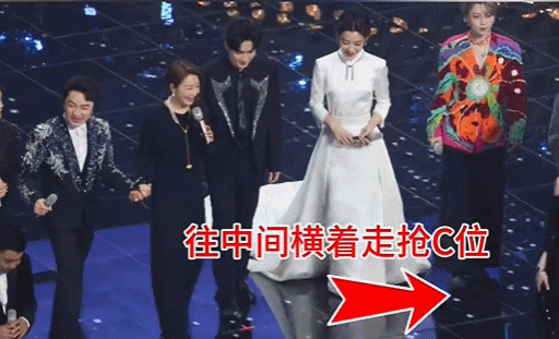 更令人意外的是,当全体艺人站成一排时,刘惜君再次横向移动至中心位置,完全忽略彩排站位,直接站在陈楚生旁边。此时王祖蓝看到刘惜君的举动后明显愣住,凭借多年主持经验硬撑场面,先为孙悦让出C位,自己因无位置可站被迫退至第二排。考虑到王祖蓝身高偏矮,通常不会安排在后排,这一调整显然打乱了原有计划。
