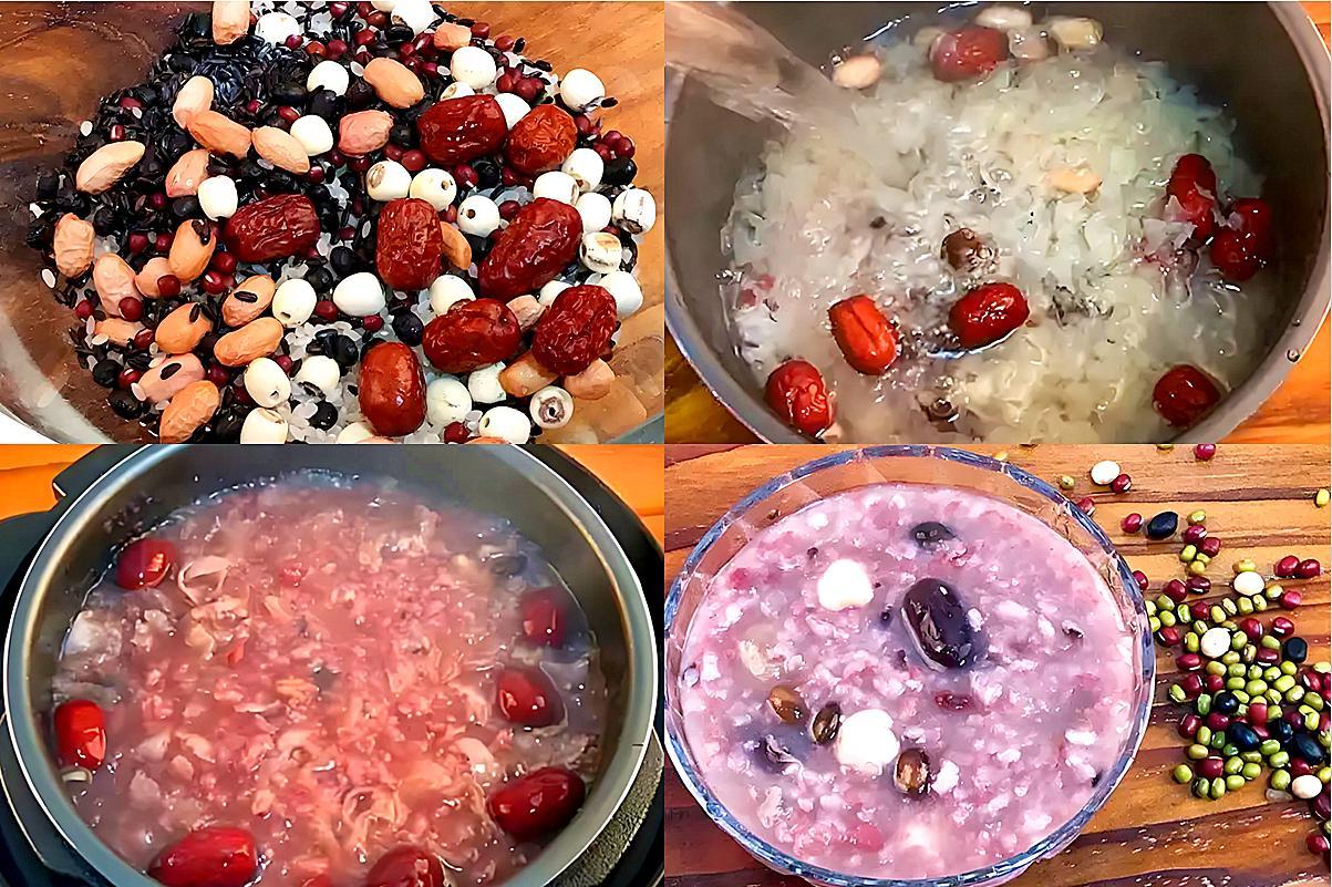 红小豆、黑豆、绿豆各15克,花生10克,紫米30克,莲子8颗,红枣4颗,干银耳5克
