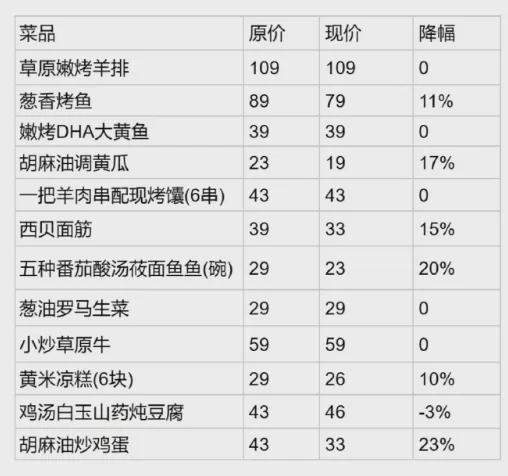 也有网友质疑降价的诚意。草原嫩烤羊排从119元降至109元,降幅不足10%,被认为远未达到网传的“最高降4成”。还有消费者发现,一道“鸡汤白玉山药炖豆腐”的价格不降反升。