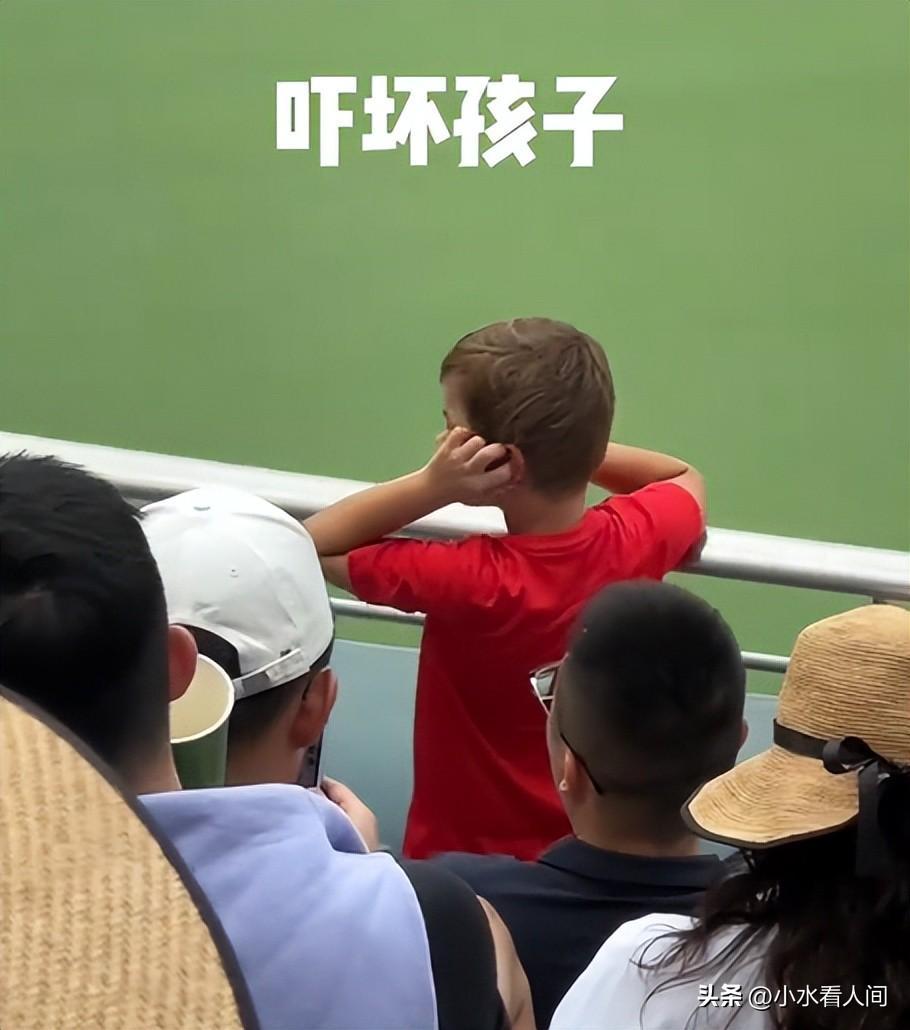一位带着混血小朋友的女子坐在第一排,离比赛球场和裁判的位置都非常近,这本是看球的绝佳位置。然而,比赛进行到一半时,这位戴眼镜的女子却开始持续发出尖叫,朝着球场大声喊叫,试图干扰比赛。原来,这场球赛有她支持的网球偶像,一看偶像占了下风,她就发疯似的吼叫,严重干扰了比赛的进行。